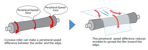 Compared with the center part, the circumferential velocity becomes faster as it goes to the end due to the difference in outer diameter. Film tends to move toward the edge with a high circumferential velocity and approach the downstream roller at a right angle. These two properties can spread the film and reduce wrinkles.